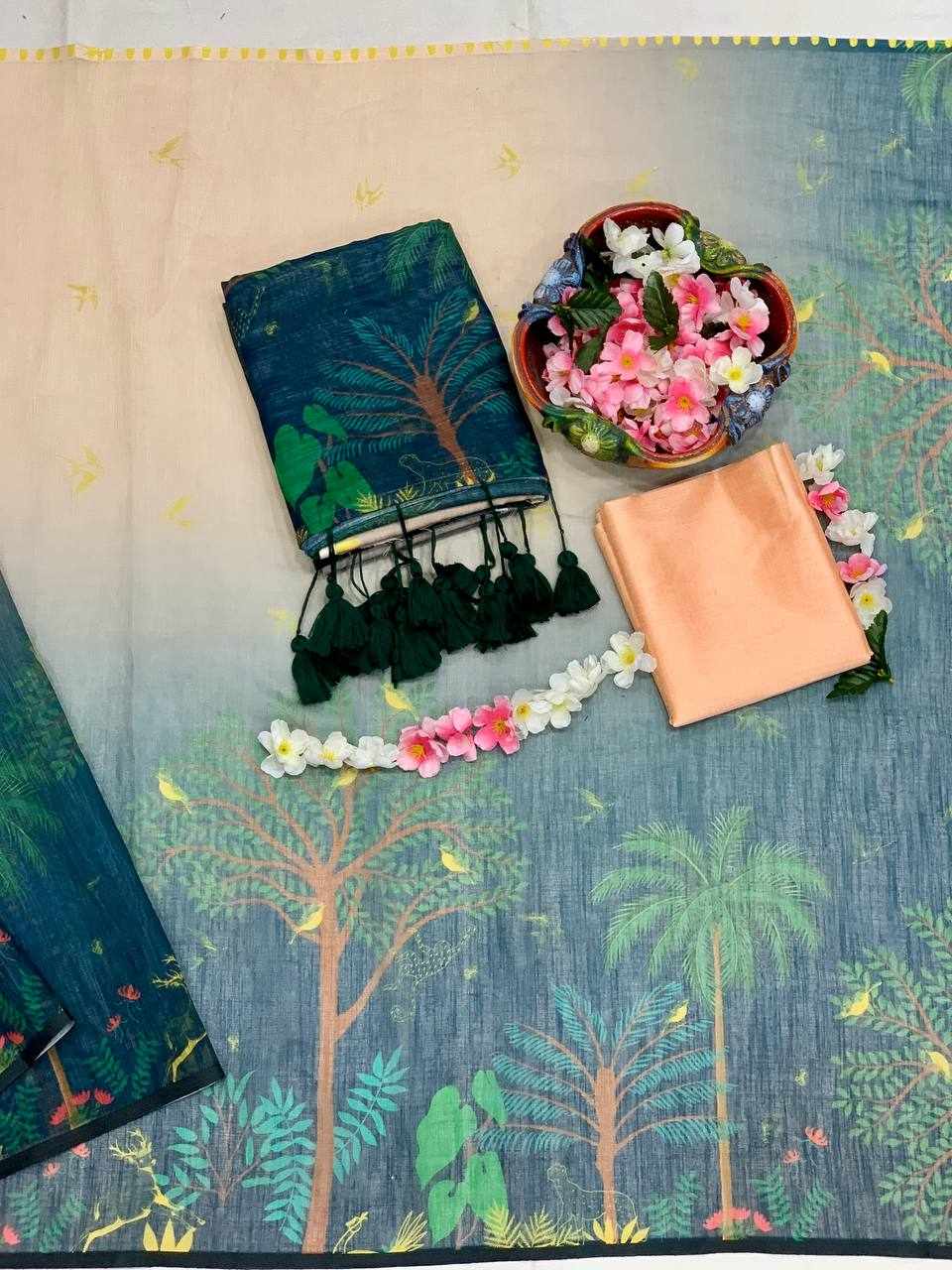 Saree Fabric: Soft Linen Cotton with beautiful digital print and elegant handmade cotton tassels