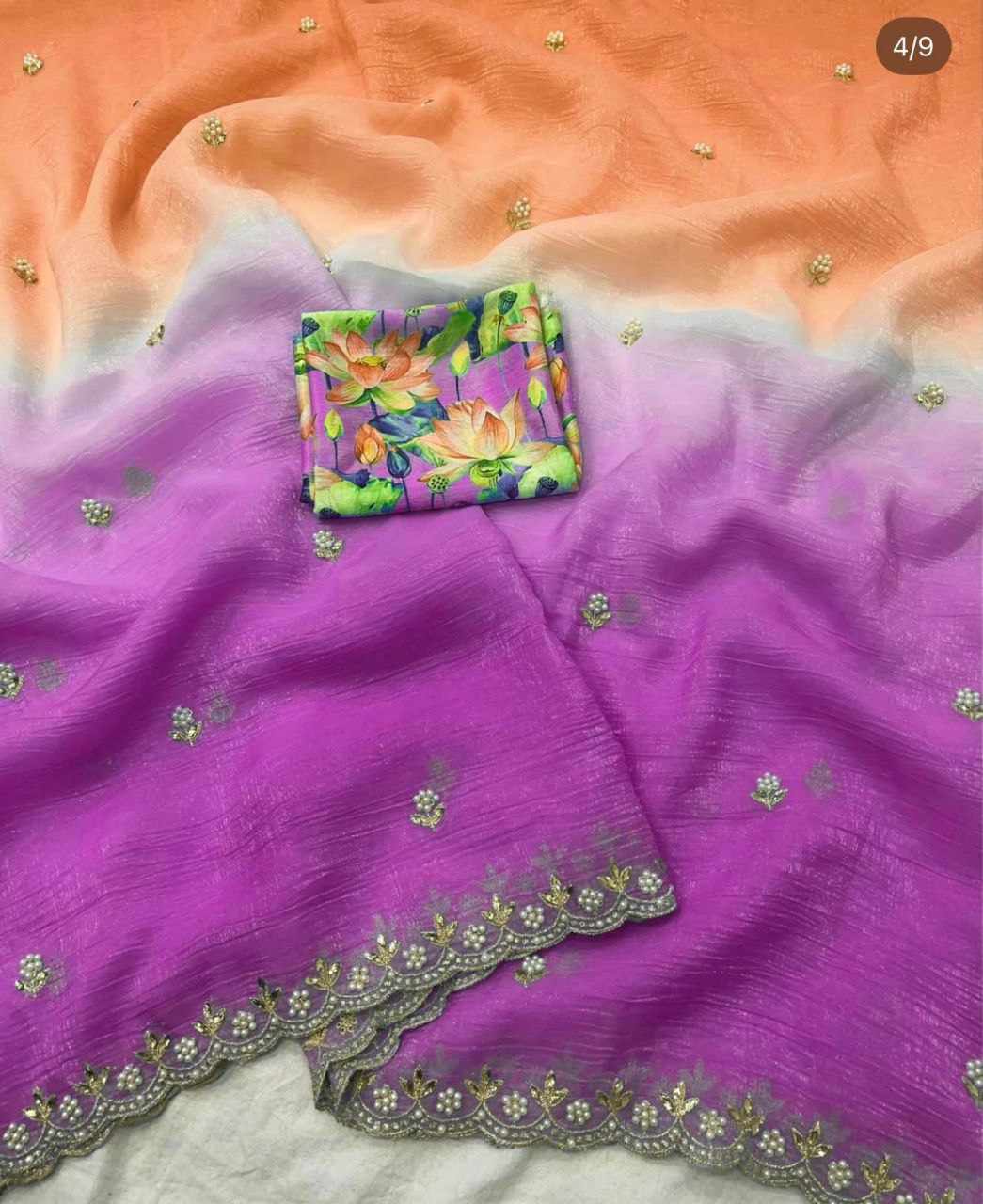 Fabric:- Candy Crush Silk With Beautiful Embroidery& Moti Work Scalloped Cut work Border